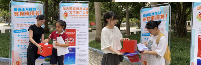 今年9月的第三周是第28届全国推广普通话宣传周(以下简称“推普周”)。为响应国家推广普通话的号召,践行“加大国家通用语言文字推广力度,促进铸牢中华民族共同体意识”精神,提升校园语言文字规范水平,国家语言文字推广基地(必赢线路检测3003)开展了一系列推普活动。本次活动旨在通过沉浸式互动体验,让师生在真实交流场景中感受普通话的魅力,营造“说普通话、用文明语”的浓厚氛围,助力铸牢中华民族共同体意识。