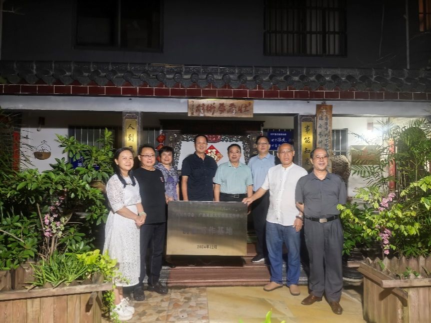 双方在揭牌仪式前进行了亲切友好的交流。容本镇向艺术村成员介绍创意写作中心的总体特征,师资概况和发展前景。创意写作中心多年深耕打造享誉区内外的“大写作”品牌,为历史悠久的“相思湖作家群”持续培养文学新生力量,亦关注区内文学发展态势,不断拓展写作基地建设,为自治区文学艺术工作添砖加瓦,推动文学在社会领域的交流、互动与碰撞,擦出新的艺术火花。陆晓芹指出,创意写作中心在壮府艺术村设立写作基地,有助于推动中心走出校园,在更多维度的文学艺术互动中开拓“大写作”品牌的特征、内涵和深度,使文学写作更好地服务于社会需要,为社会发展提供坚实的文化赋能。