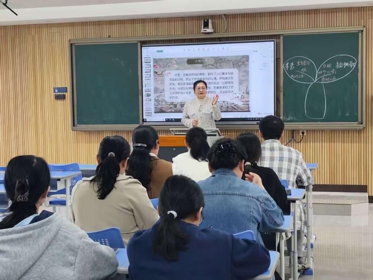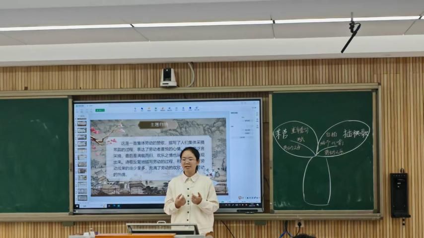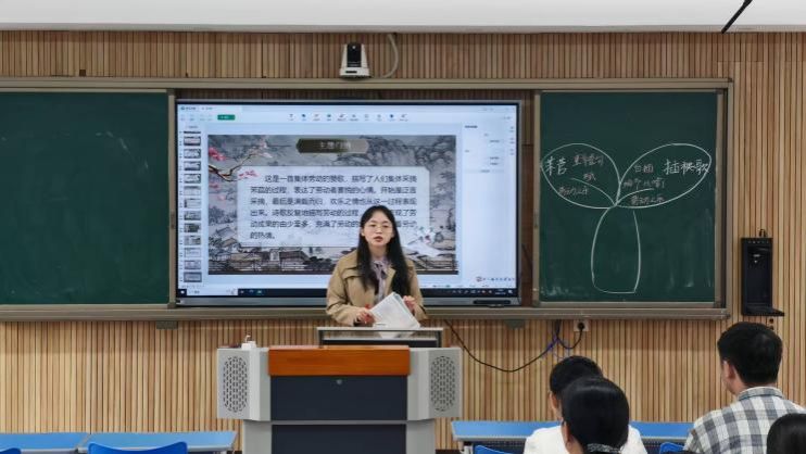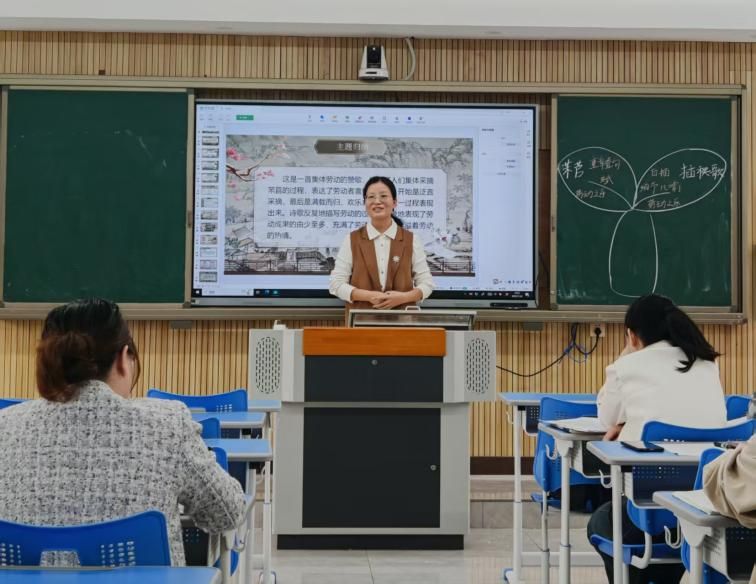 在题为《芣苢》《插秧歌》联读的展示课上,黄丽湘首先通过生动的AI动画视频,直观再现了西周与宋代的劳动场景,使学生在强烈的视觉对比中,初步感悟《芣苢》与《插秧歌》迥异的劳动氛围。随后,课堂以两首诗的核心动词为切入点,深入分析了《芣苢》“重章叠句结合赋体”的回环往复之美、《插秧歌》“白描辅以比喻”的生动传神之妙。最后,黄老师创设了情景体验与创意练笔环节,在品读与创作中深刻体悟劳动的欢悦与艰辛,从而深化对劳动之美的理解。